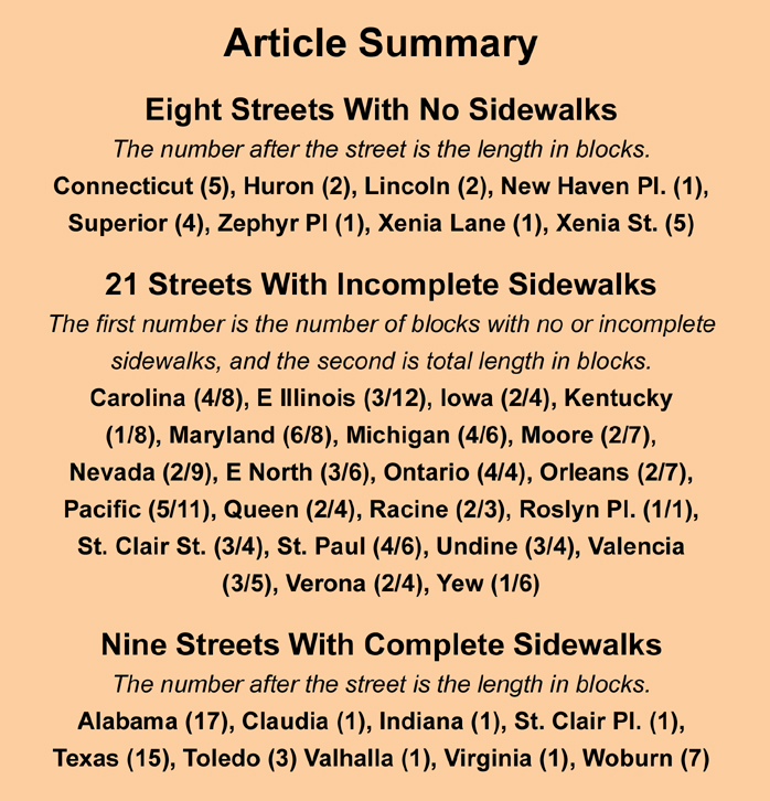It runs three blocks between Woburn and Superior. It continues for two more blocks between Michigan and St. Clair. All sections have no sidewalks or curbs.