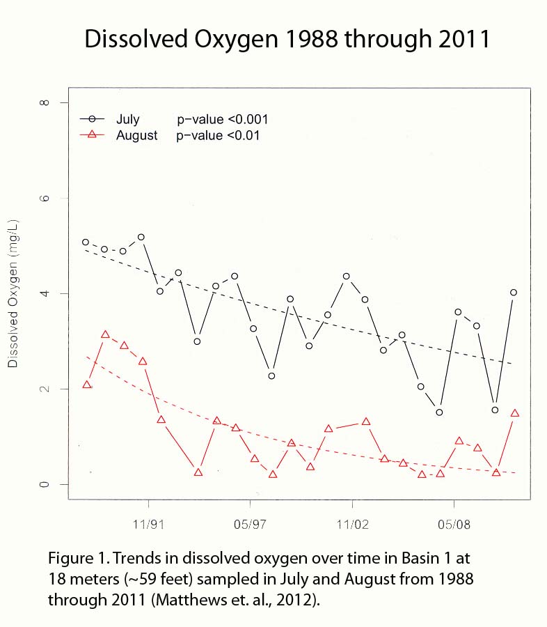 Ammonium and hydrogen sulfide formed under anoxic conditions by bacterial degradation were lower in concentration than usual. Matthews et. al. (2012) suggested this may have been due to cooler temperature conditions that shortened the length of time the lake was thermally stratified.
