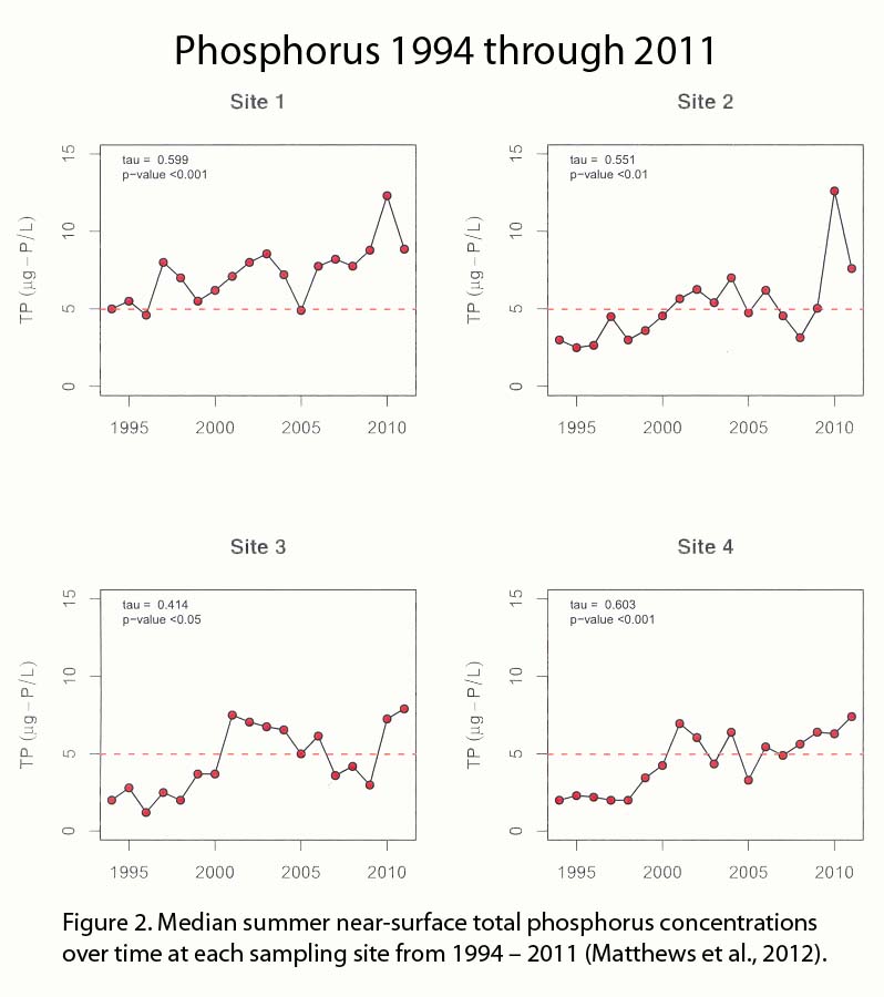As you look at the data in the figures, keep in mind that 2003 through 2005 water temperatures were unusually warm, resulting in the data showing accelerated increases in algal numbers, total phosphorus, and chlorophyll (an indicator of algal biomass), with concurrent severe oxygen depletions once the lake stratified. Moreover, data from the four sampling sites show that all three basins of the lake were adversely affected (see Figures 1- 5). Conversely, in 2007, 2008, 2009 and 2010 temperatures were unusually cold and the data reflect a slowing of the degradation and in some instances a reversal in trends. Long-term water quality monitoring reveals, however, that though there can be wide variability in data from year to year, the overall trends are progressively downward even with the tempering effects of cooler temperatures.