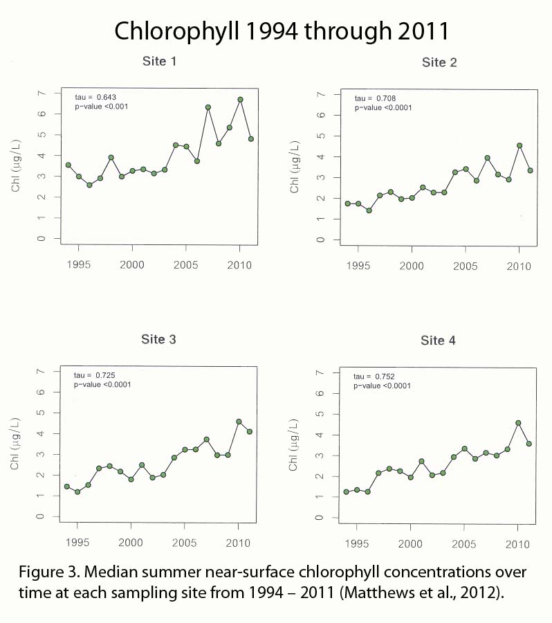 Median near-surface summer chlorophyll concentrations decreased slightly in all three basins compared to record-setting high levels measured in 2009-10 monitoring year (see Figure 3).