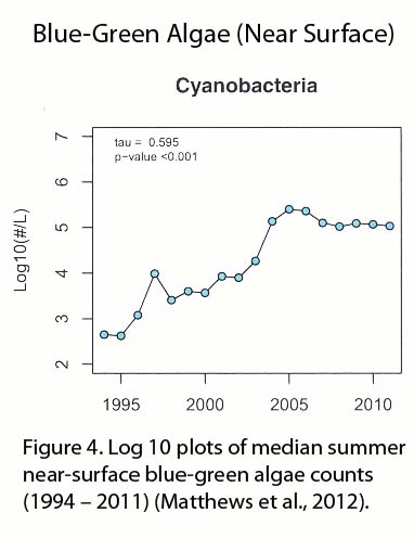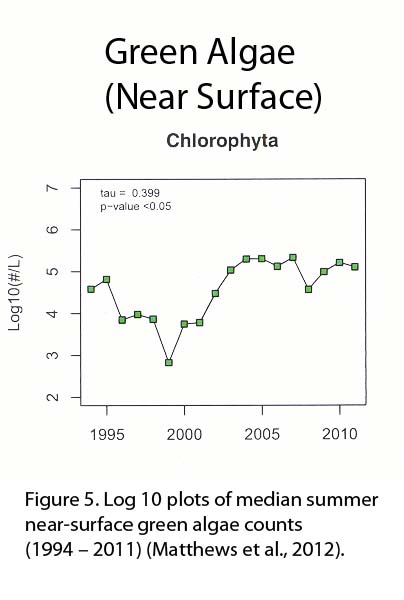 Algal blooms during the summer months again clogged the city’s water treatment filters for a third year in a row causing poor water filtration rates at the water treatment facility. Only the early implementation of voluntary water restrictions prevented mandatory restrictions from being imposed later in the summer (Figures 4 and 5).
